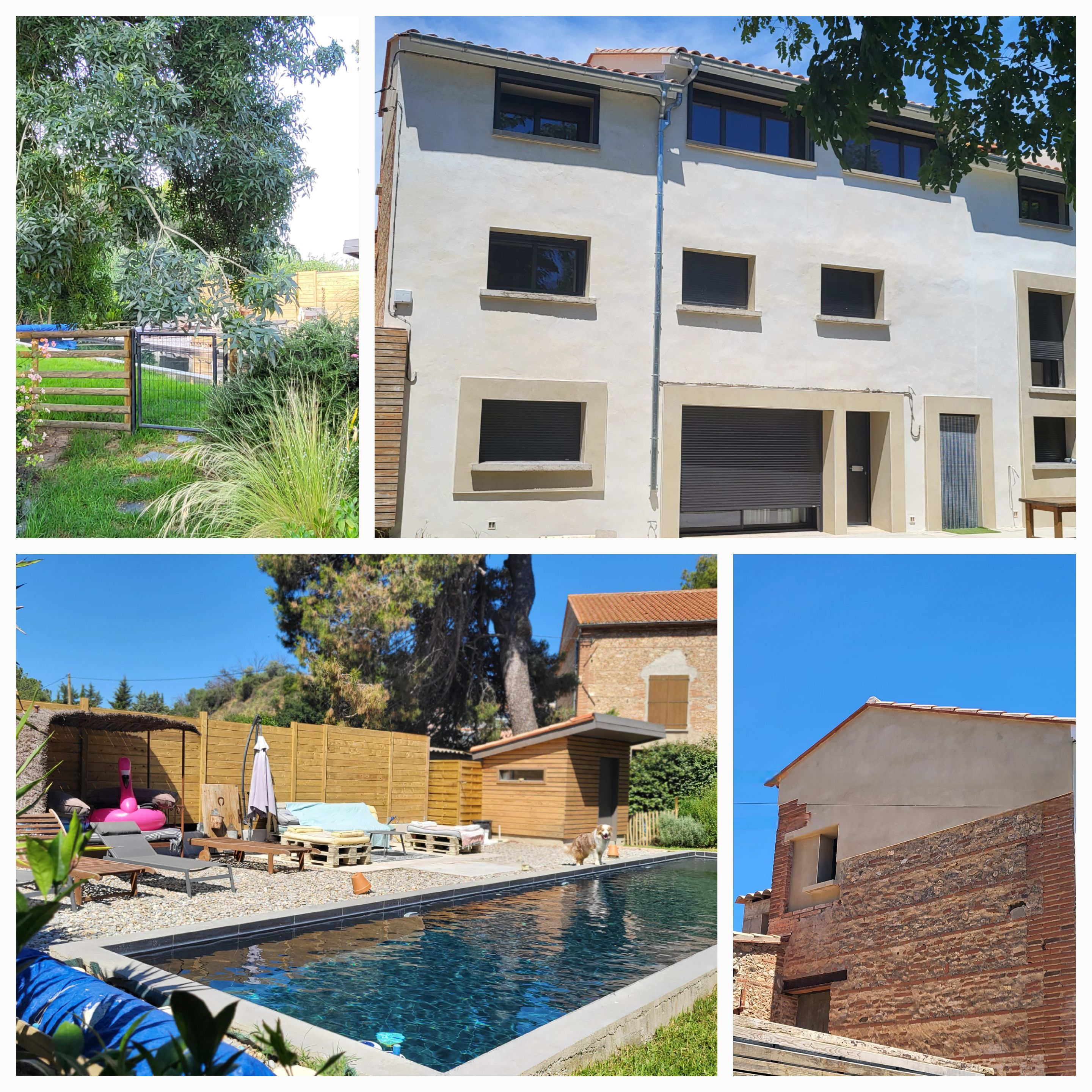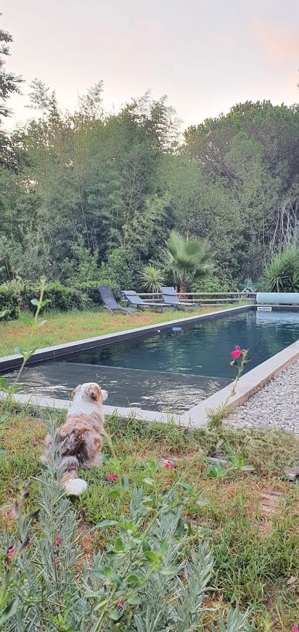 A l'écart de la bâtisse, vous trouverez une piscine avec sa plage californienne, des transats posés sur le gazon, un coin salon à l’ombre et à l’abri des regards.