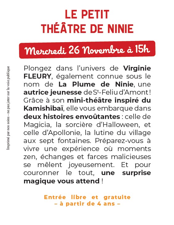 Le mercredi 26 novembre à 15h, à la médiathèque de Saint-Féliu d'amont, La Plume de Ninie vous invite pour des contes envoûtants grâce à son mini-thèâtre inspiré du Kamishibaï : l'histoire de Magicia, la sorcière d'Halloween et celle d'Apollonie, la lutine du village aux sept fontaines.