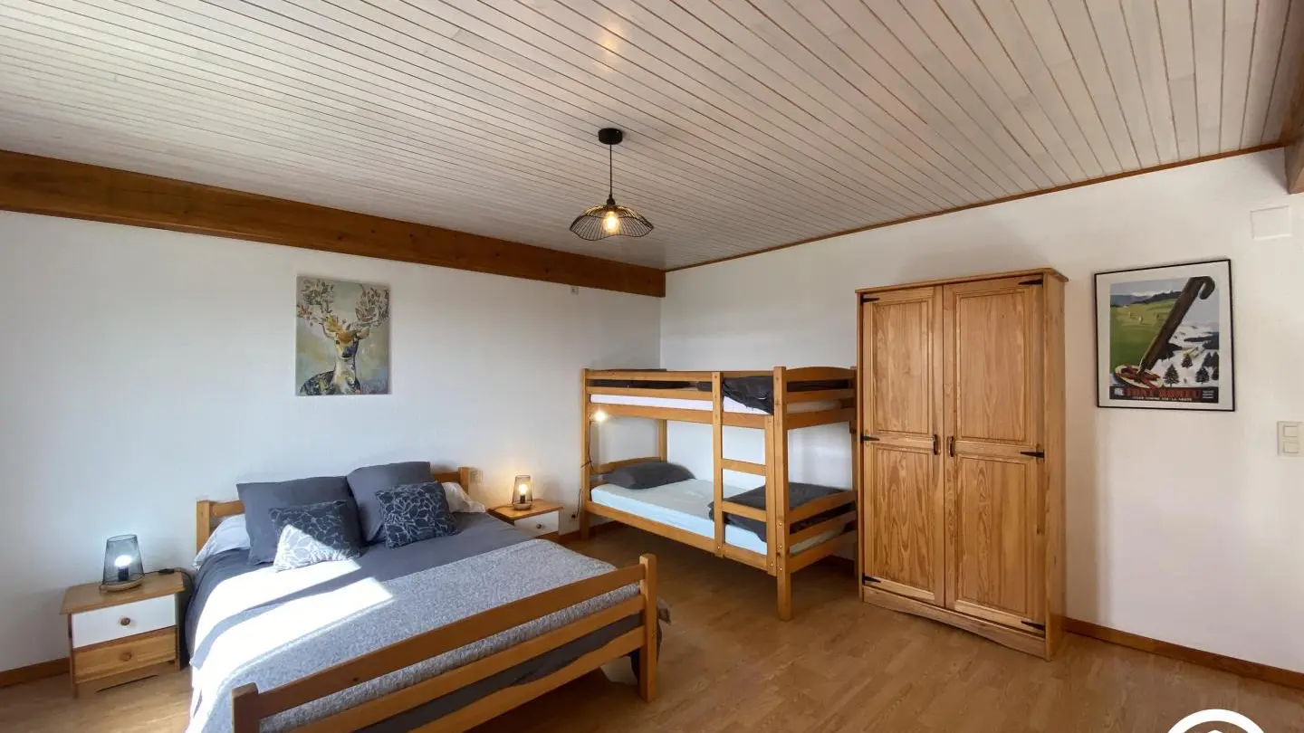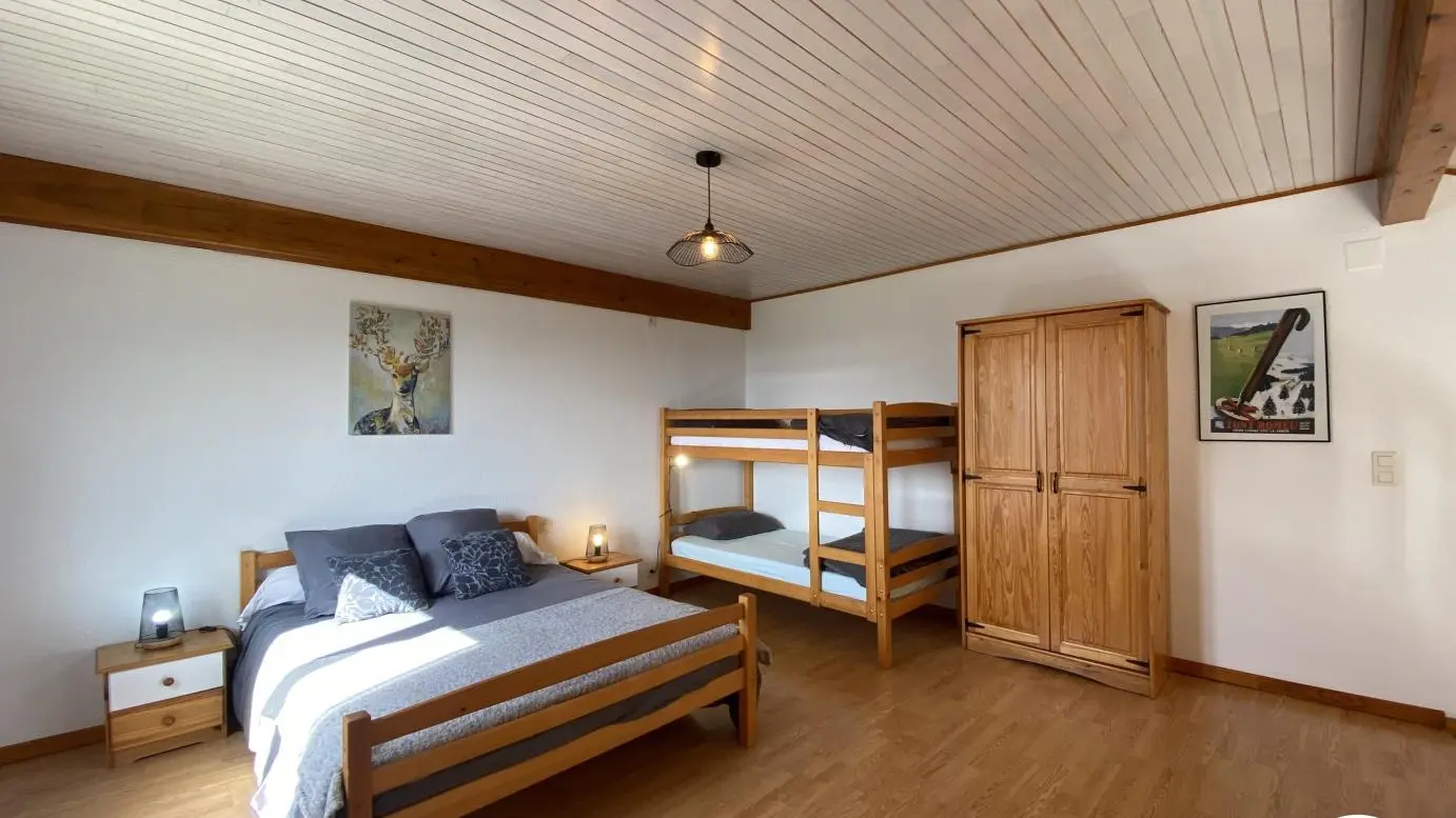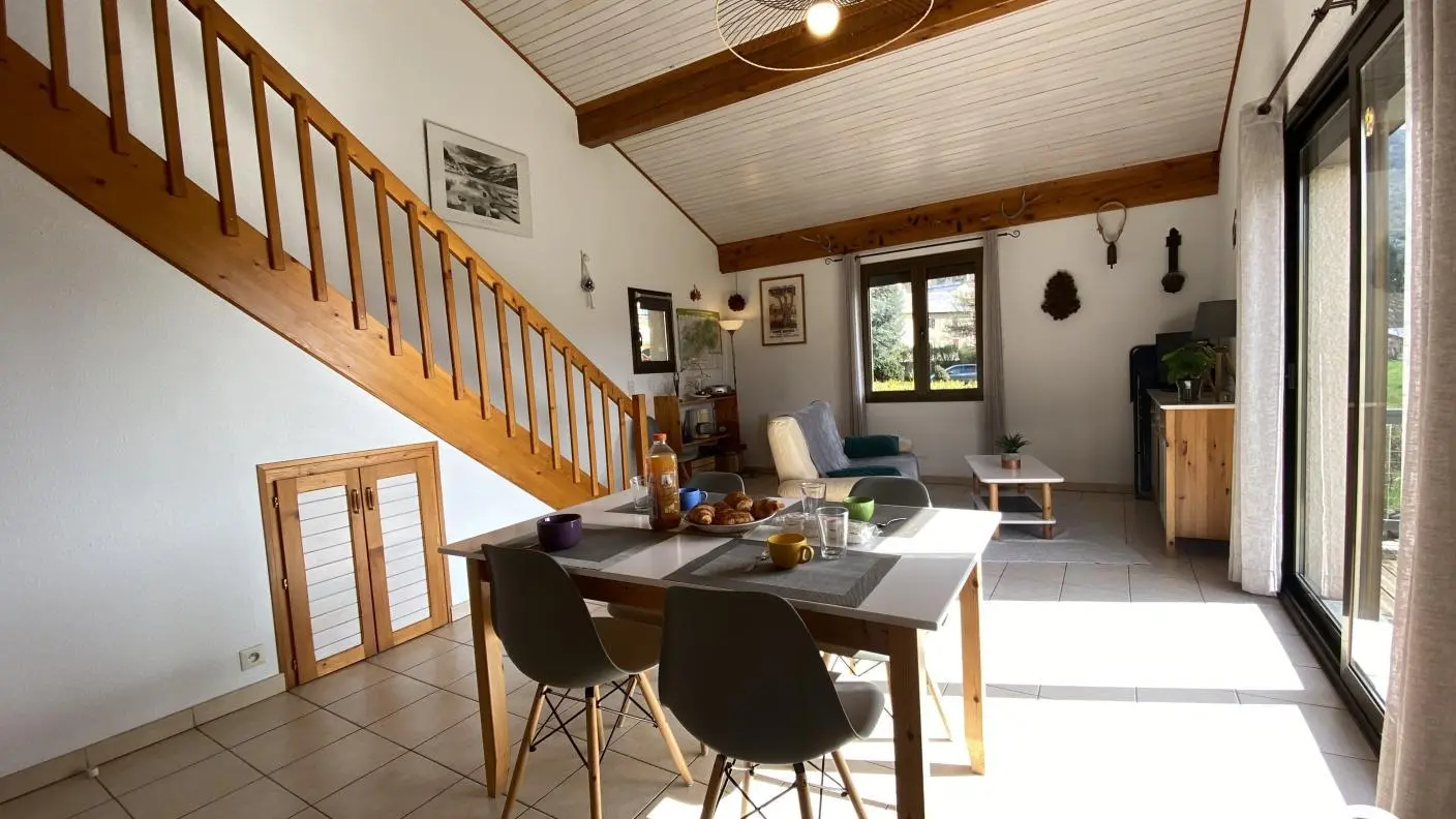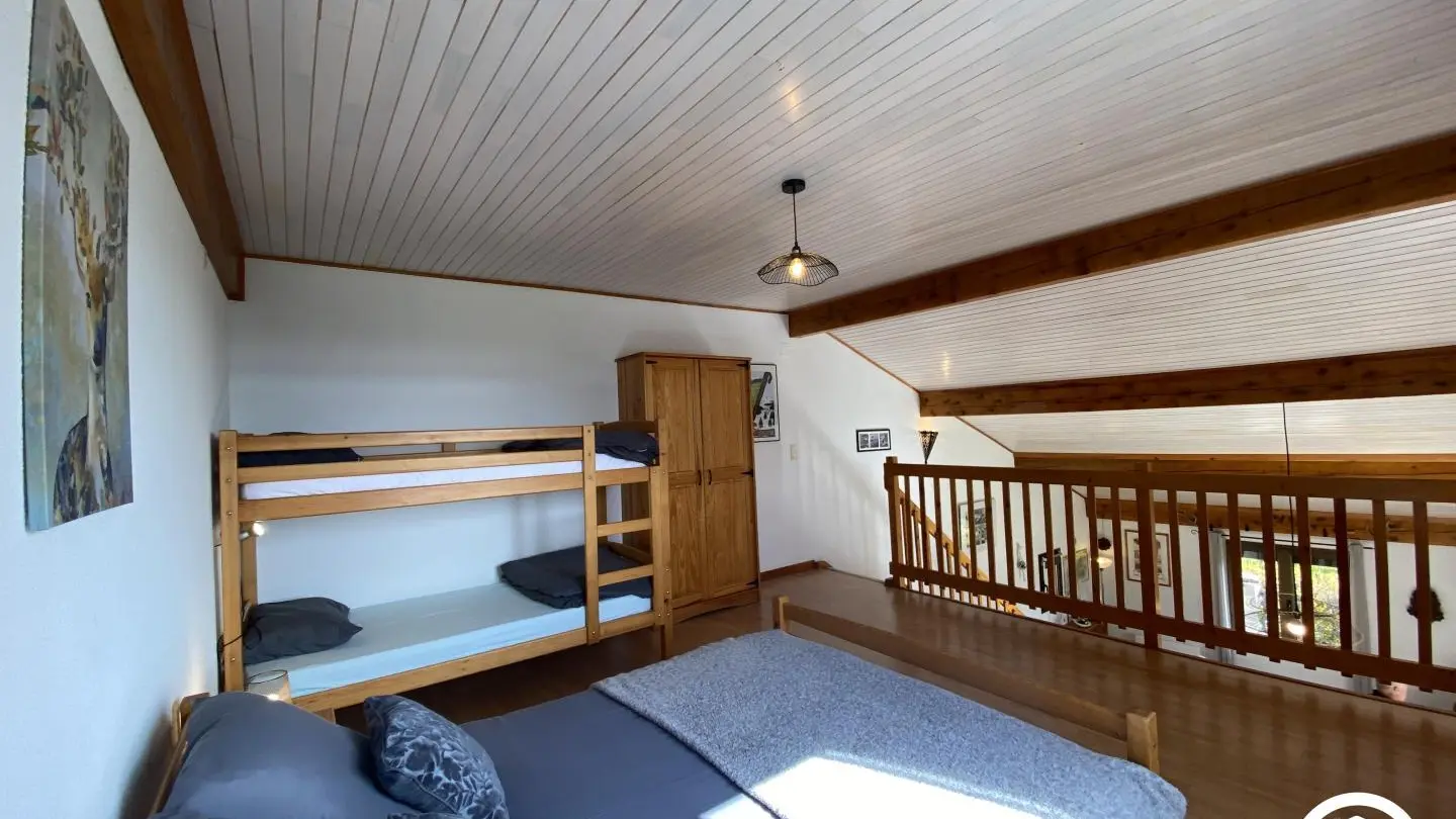 Rez-de-chaussée : - séjour avec coin cuisine - chambre 1 : 1 lit 140x190 - salle d'eau - Wc indépendant Premier étage : - 1 chambre en mezzanine ouverte sur le séjour : 1 lit 140x190 + 2 lits superposés en 90x190 Jardin avec barbecue et parking sur place (2 voitures possible). WIFI disponible. Un 2ème logement de vacances est également aménagé à proximité.
